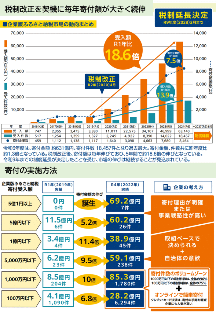 - 特に2021年以降、受入額、件数、企業数ともに急増し、年間寄附件数は1万件超、寄附企業数も7,680件に達しています(2023年時点)。