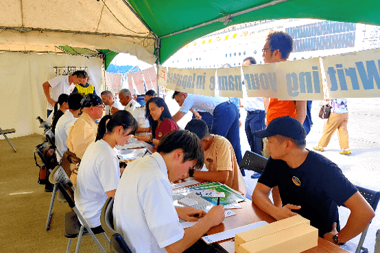 おもてなしの一環で高校生ボランティア等を募集し 「浴衣着付け体験」「名前を日本語で書いてプレゼント」ブースを運営