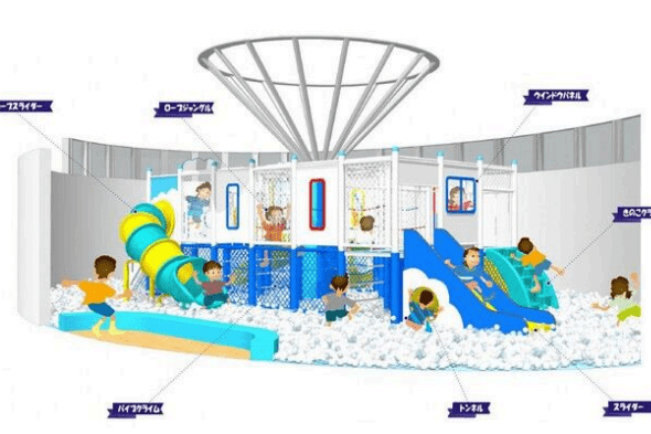 乳児から小学生までを対象とした屋内遊戯施設では、安心して遊べる環境づくりを行います。また、体を動かすことが好きな子どもたちが楽しめる「チャレンジひろば」「ボールプールひろば」や、静かにおままごとや本を読むことが好きな子どもたちが、それぞれの世界に浸ることができる「もくもくのまち」、赤ちゃんのための「すくすくガーデン」など、エリアによってさまざまな楽しみ方ができます。屋外エリアでは、ダイナミックに水遊びができる複合遊具を置き、暑い夏でも楽しみながら屋外で体を大きく動かす水遊びが楽しめます。