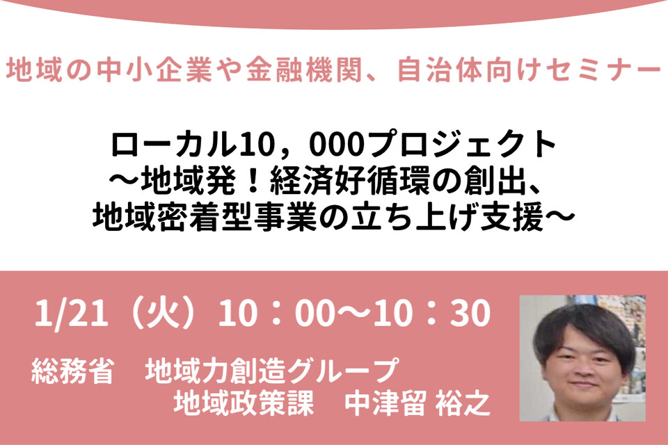 2025年1月21日(火)10:00〜10:30、総務省の担当者が登壇し、セミナー「ローカル10,000プロジェクト(地域経済循環創造事業交付金)~地域発!経済好循環の創出、地域密着型事業の立ち上げ支援~」を開催します。